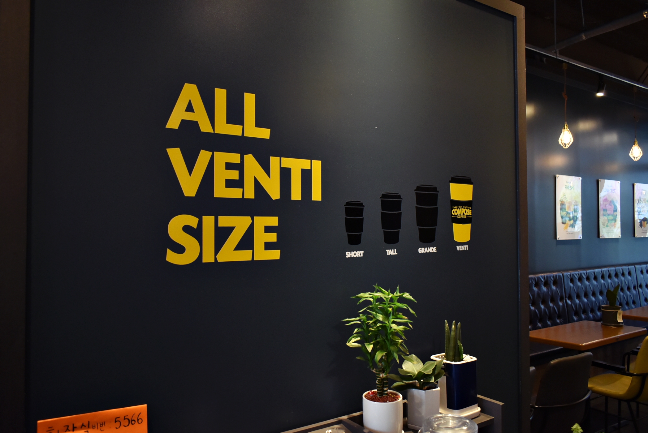 컴포즈커피 시그니처 컬러라고 할 수 있는 노란색을 주요 인테리어 포인트로 하여 곳곳에 컴포즈커피의 로고가 붙어 있었는데요.