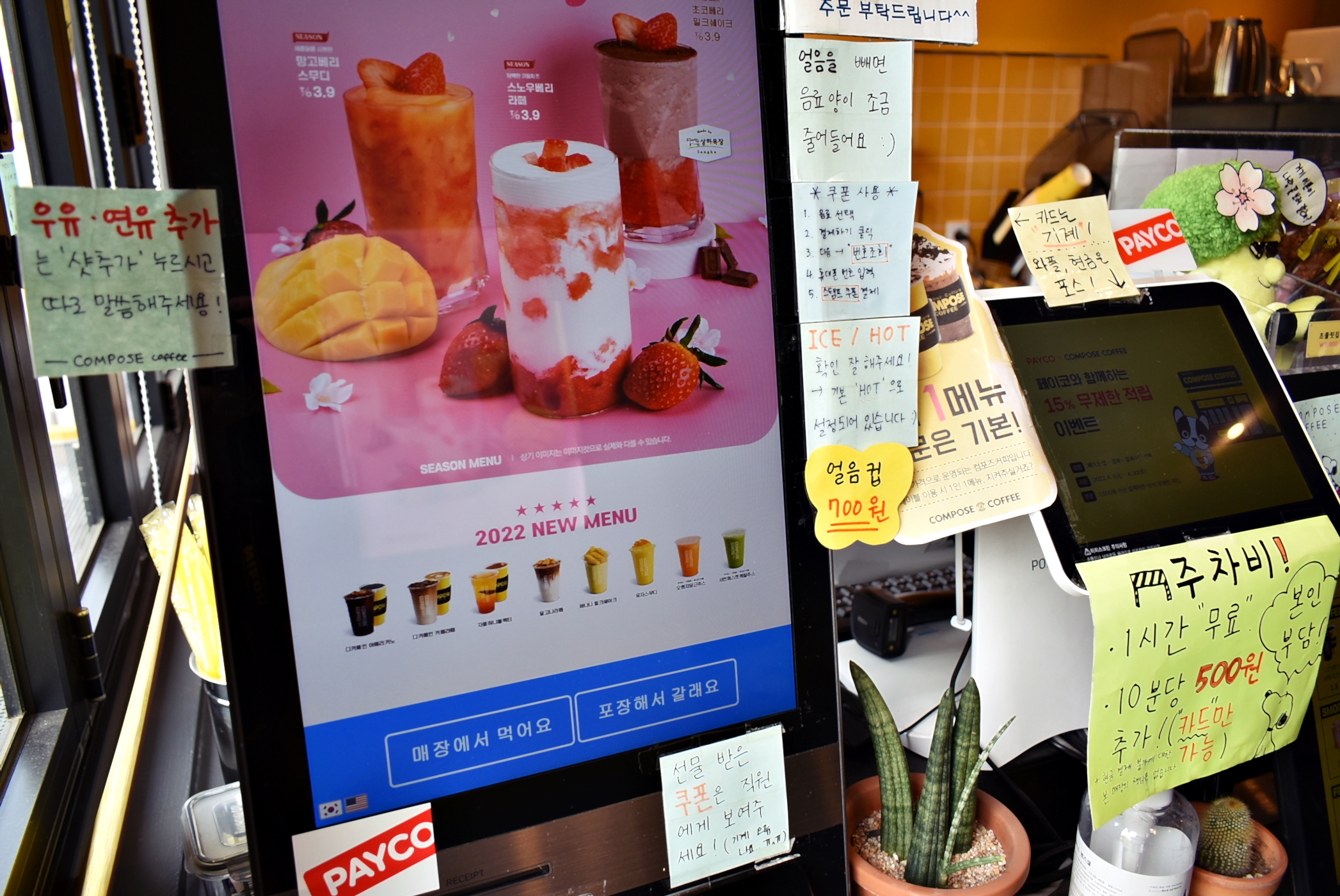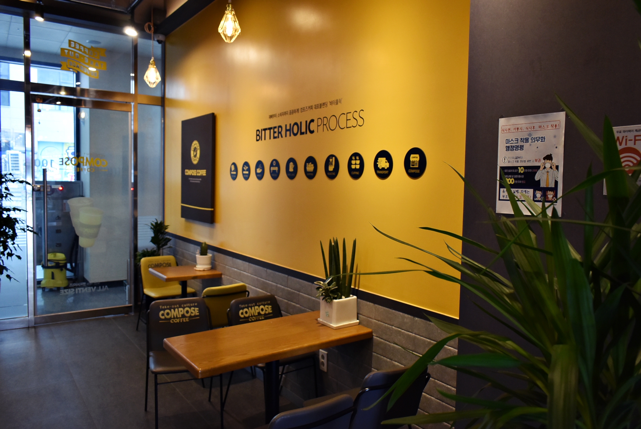 컴포즈커피 시그니처 컬러라고 할 수 있는 노란색을 주요 인테리어 포인트로 하여 곳곳에 컴포즈커피의 로고가 붙어 있었는데요.