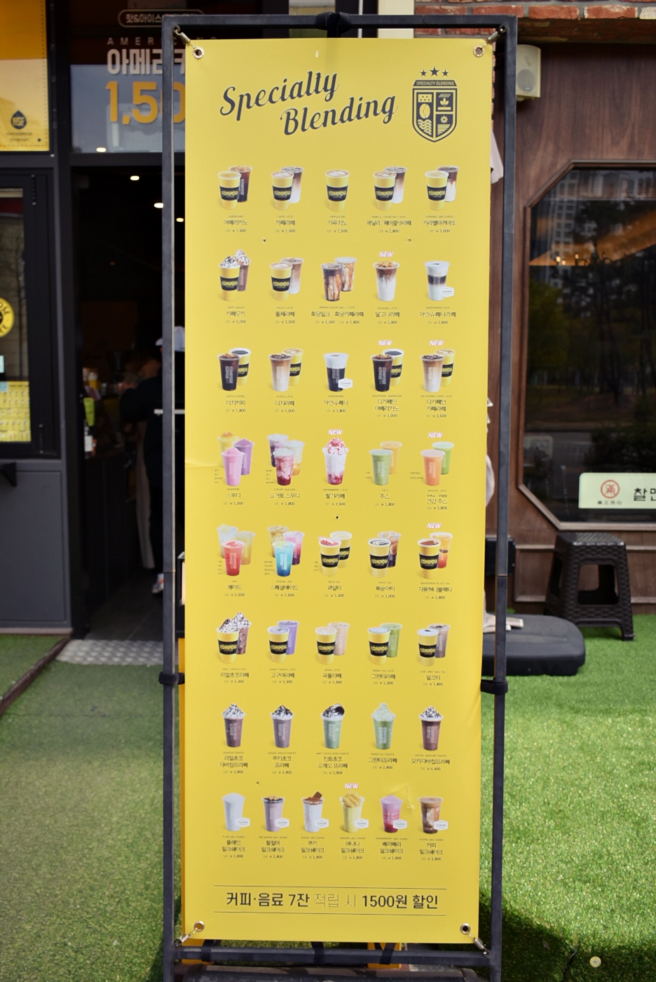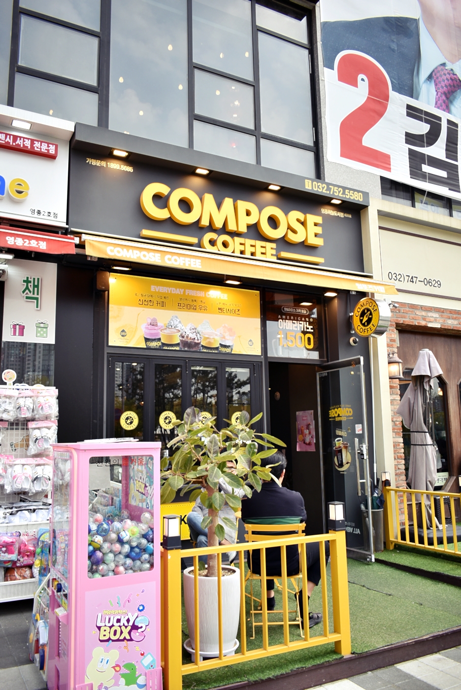 야외에 테라스 공간이 있어 테이블 1개가 있어 그 공간에 남자 손님 2명이 커피를 드시고 계셨고 그 옆으로 컴포즈커피 메뉴가 적혀 있는 배너가 있었는데요.