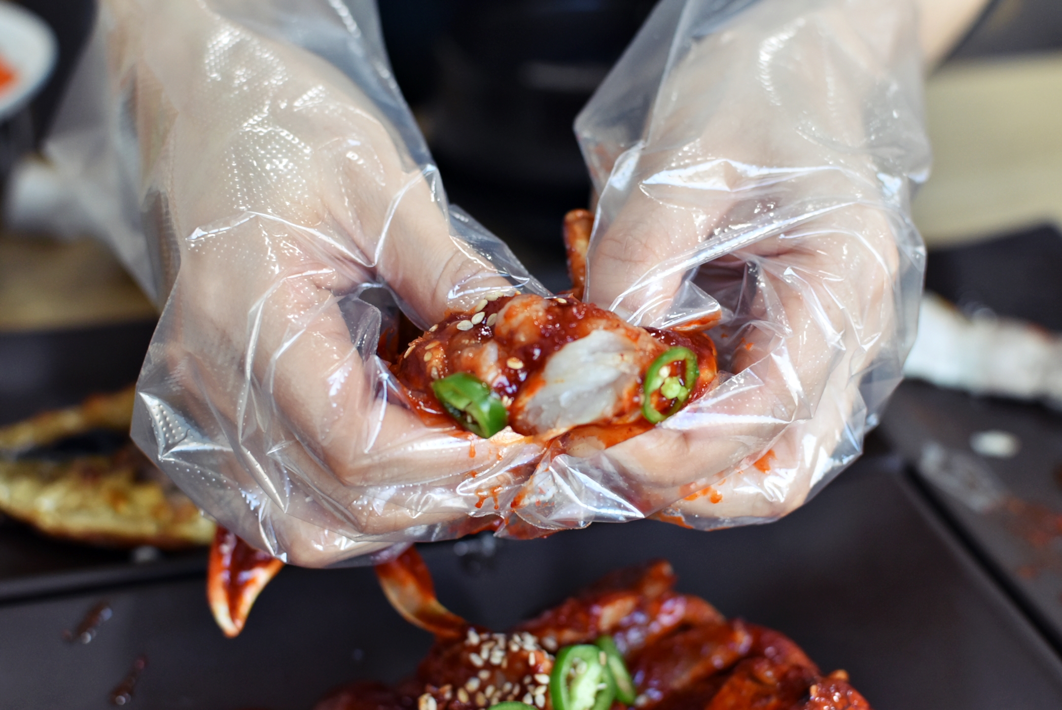 함께 나온 양념게장이 있기 때문에 양념게장을 비닐장갑 끼고 발라가면서 보리밥과 함께 먹어도 잘 어울렸습니다.