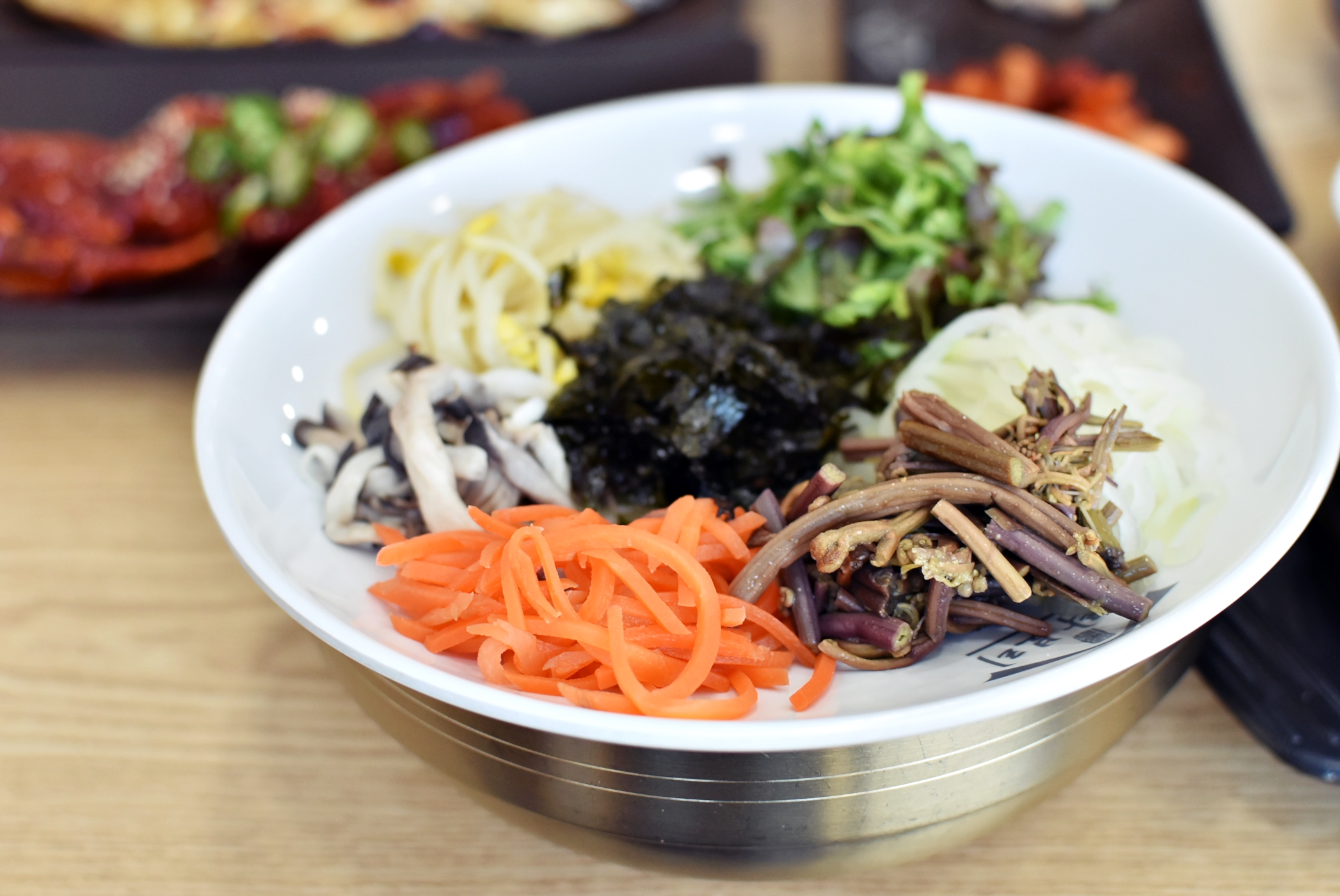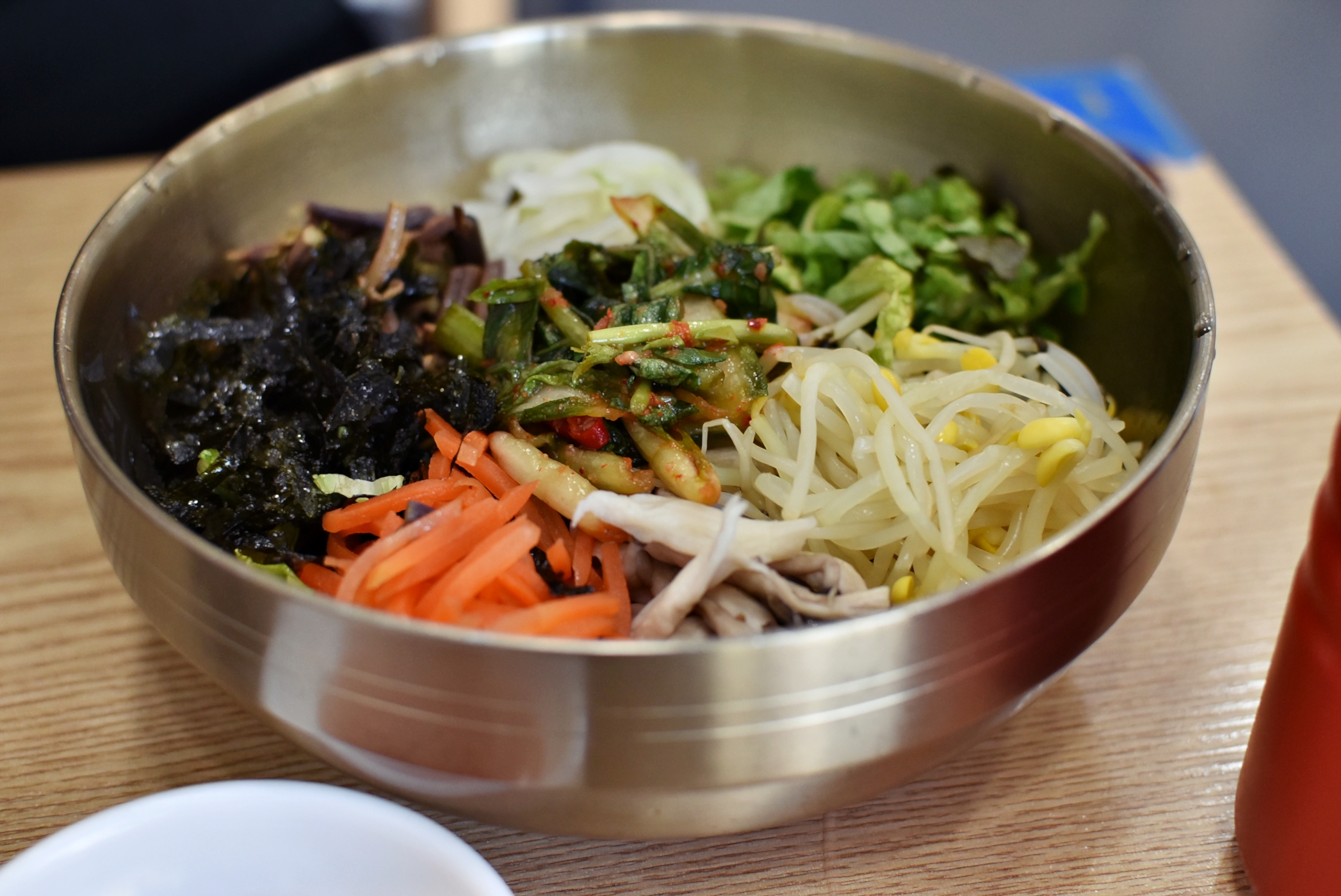 테이블 위에 양념장과 참기름이 있기 때문에 기본 나물과 열무김치를 넣어준 다음 고추장을 넣어서 참기름과 함게 비벼 주었는데요.