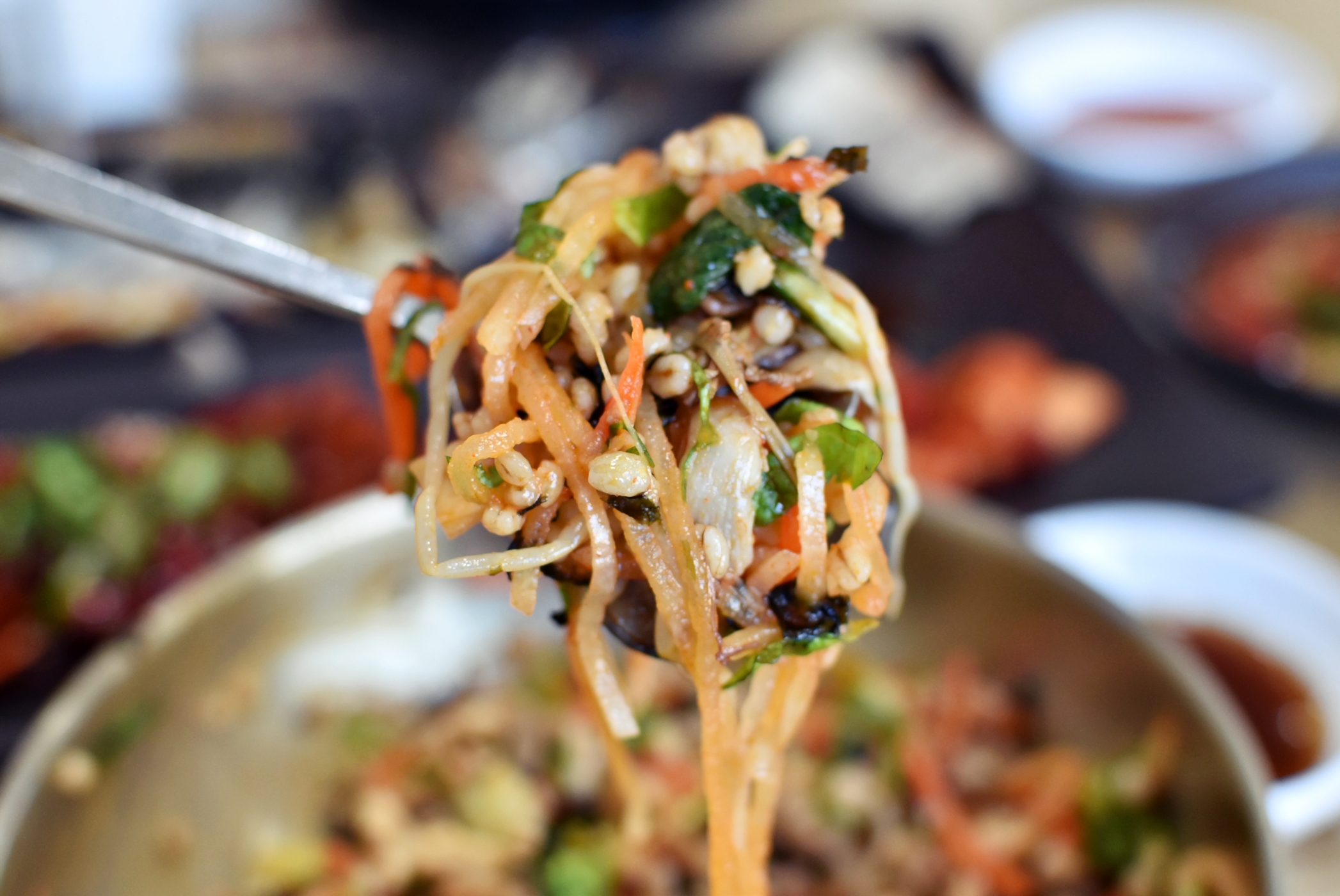 이제 보리밥에 나물을 넣어서 비벼 먹을 차례인데요.