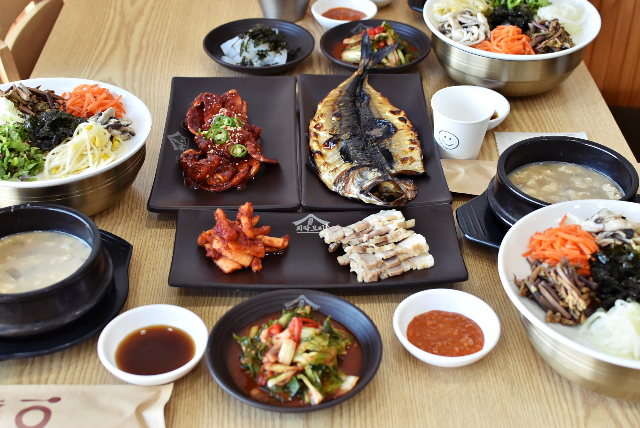 구성은 위에 보이는 것처럼 보리밥과 나물에 청국장이 나오고, 거기에 잘 어울리는 기본 반찬과 함께 메인 메뉴라고 할 수 있는 고등어구이와 양념게장에 보쌈까지 나왔는데요.