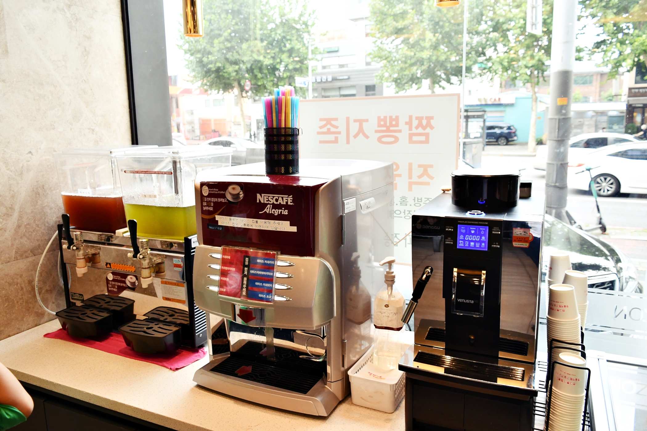 매장으로 들어가면 바로 우측 편에 이렇게 식사하는 고객들을 위해 셀프코너를 마련해놓고 있어 시원한 음료나 커피도 마실 수 있어 저도 식사 후 시원한 음료와 커피도 마시고 왔는데요.